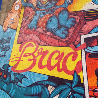 I can't talk about Brač without quickly mentioning an abandoned apartment complex down the road from town. I wish I knew more of its back story, but today it sits along a beautiful part of the sea abandoned, with broken windows and doors. In contrast to its derelict nature, it's exterior has been completely transformed into a colorful mix of paintings and graffiti. I made Doug pull over so I could snap a few pictures with the girls. Check 'em out: