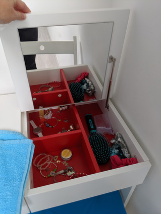 Paige was especially into it. She took every single item of her clothing out and found a spot for each. She hung some things in the closet; others were placed meticulously on the lower shelves. She then moved onto organizing all the girls' jewelry and knick knacks into the vanity table. I hadn't even realized it had the little storage compartment & mirror, but she found it right away and loved it! She even added a few things that she called "part of her morning routine", including a glass of water, couple of cherry tomatoes and a handful of peanuts (salted & spicy varieties) - pictured far left below.
