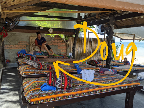 Beach Runs/Walks: I got two morning runs in, but Doug ran every morning while me & the girls were still slumbering. The beach is at really low tide in the morning, so it makes for some awesome hard-sand running. Massages: Par for the course, Lanta Castaway had a hut on the beach set up for massages. One-hour Thai with Oil massages cost about $12 USD. 30-minute Child massages cost $8. Time to get our massages on! Much to the girls chagrin, we did not let them indulge in massages every time we did (‘cmon, they’re only 6 & 8 years old!). They got to go twice, and we got massages four times. Glorious to get a massage with the fresh air & ocean breeze around you. Really felt like holiday.