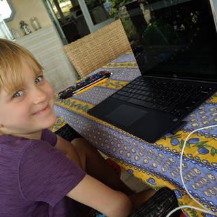 Most of the time we're hunkered down at a table at our "home" of the day/week, tapped into the online curriculum (with one of us always sitting alongside one, hearing the lesson, answering their questions & observing their online exercises/assessments) and then supplementing with offline notebook work to reinforce the concept.